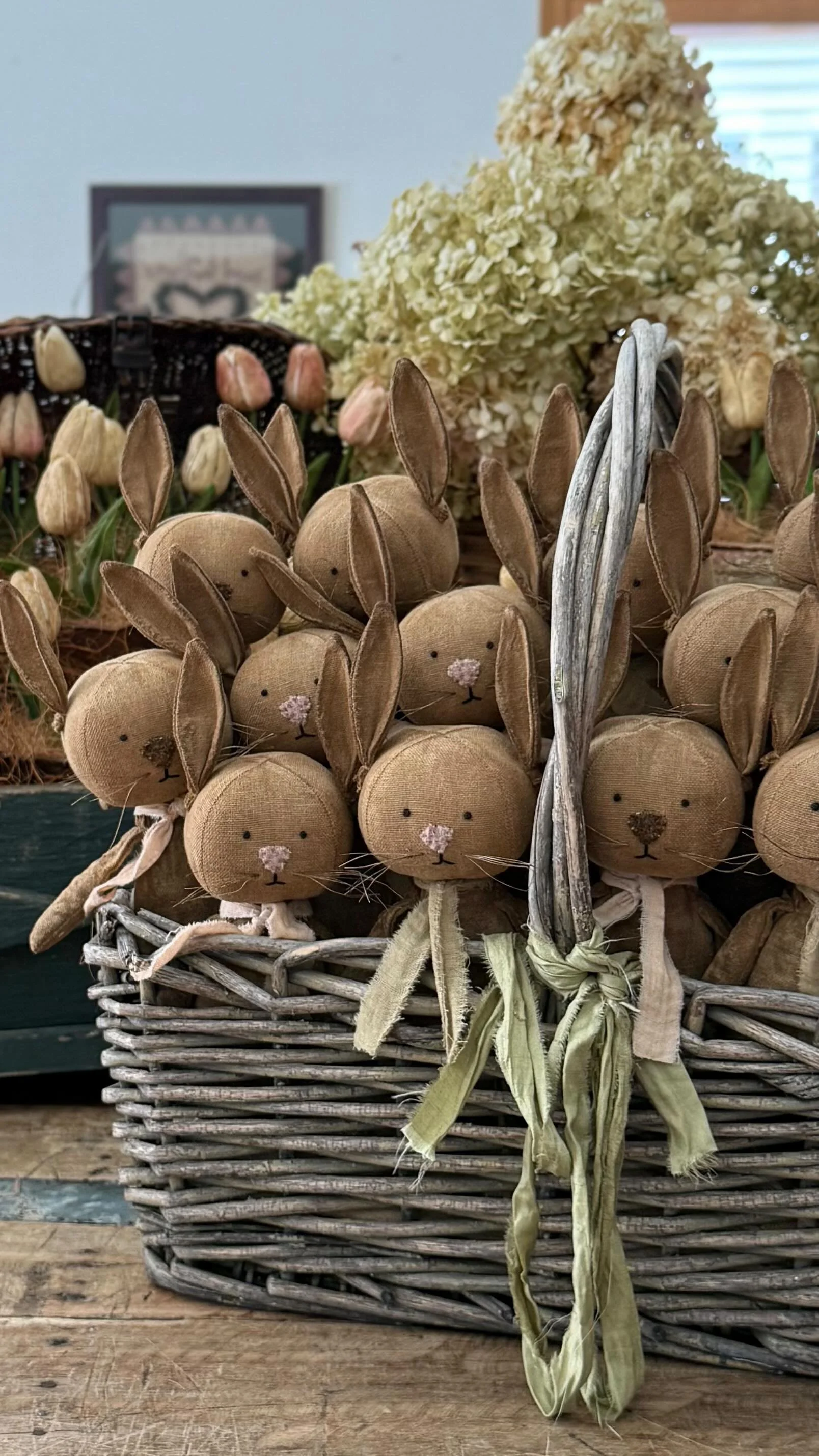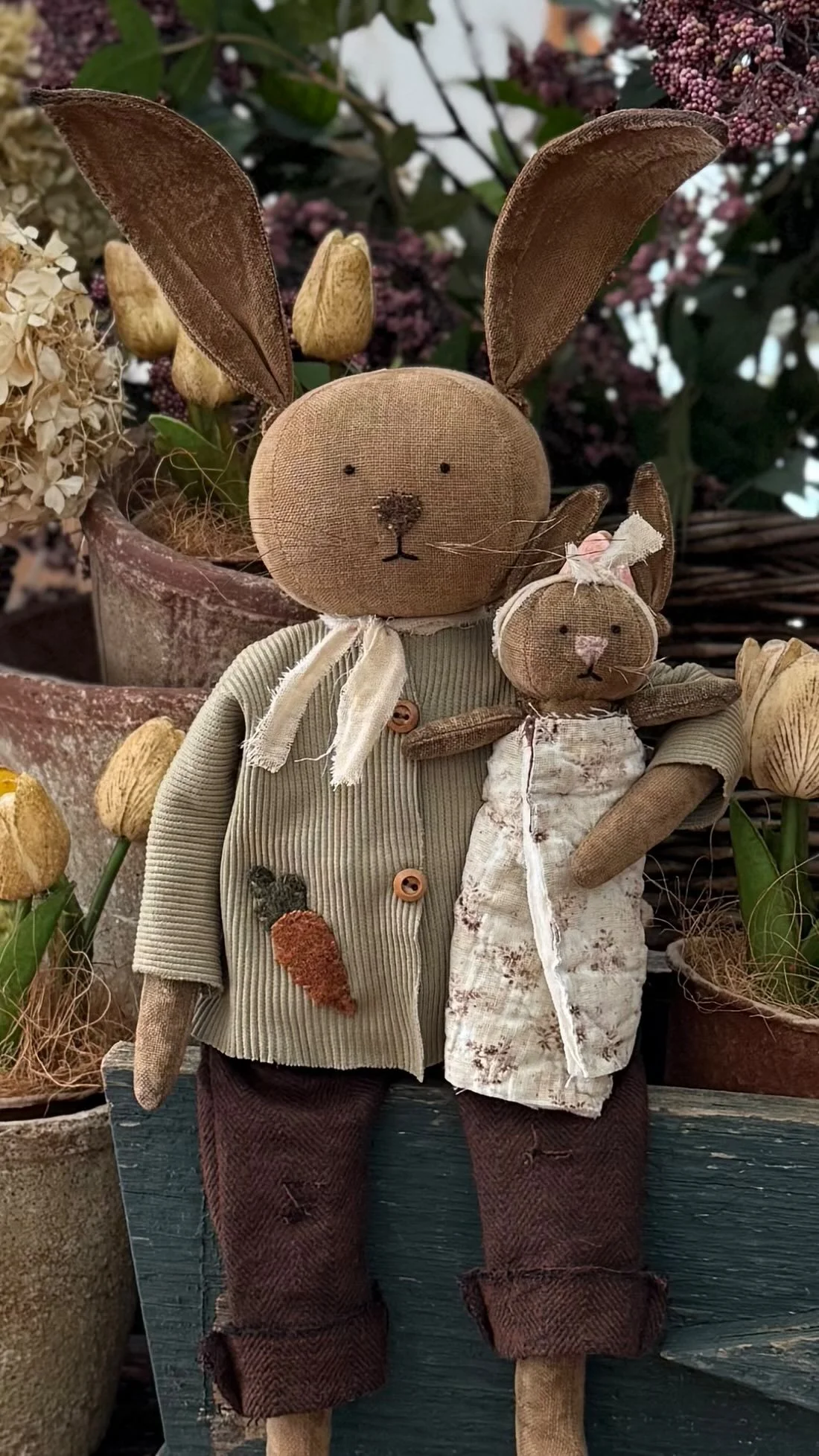 He's made of aged fabrics with "olde rabbit" stenciled on his front. His facial features are hand-stitched with whimsical whiskers. His ears are posable and he holds a grubby carrot.